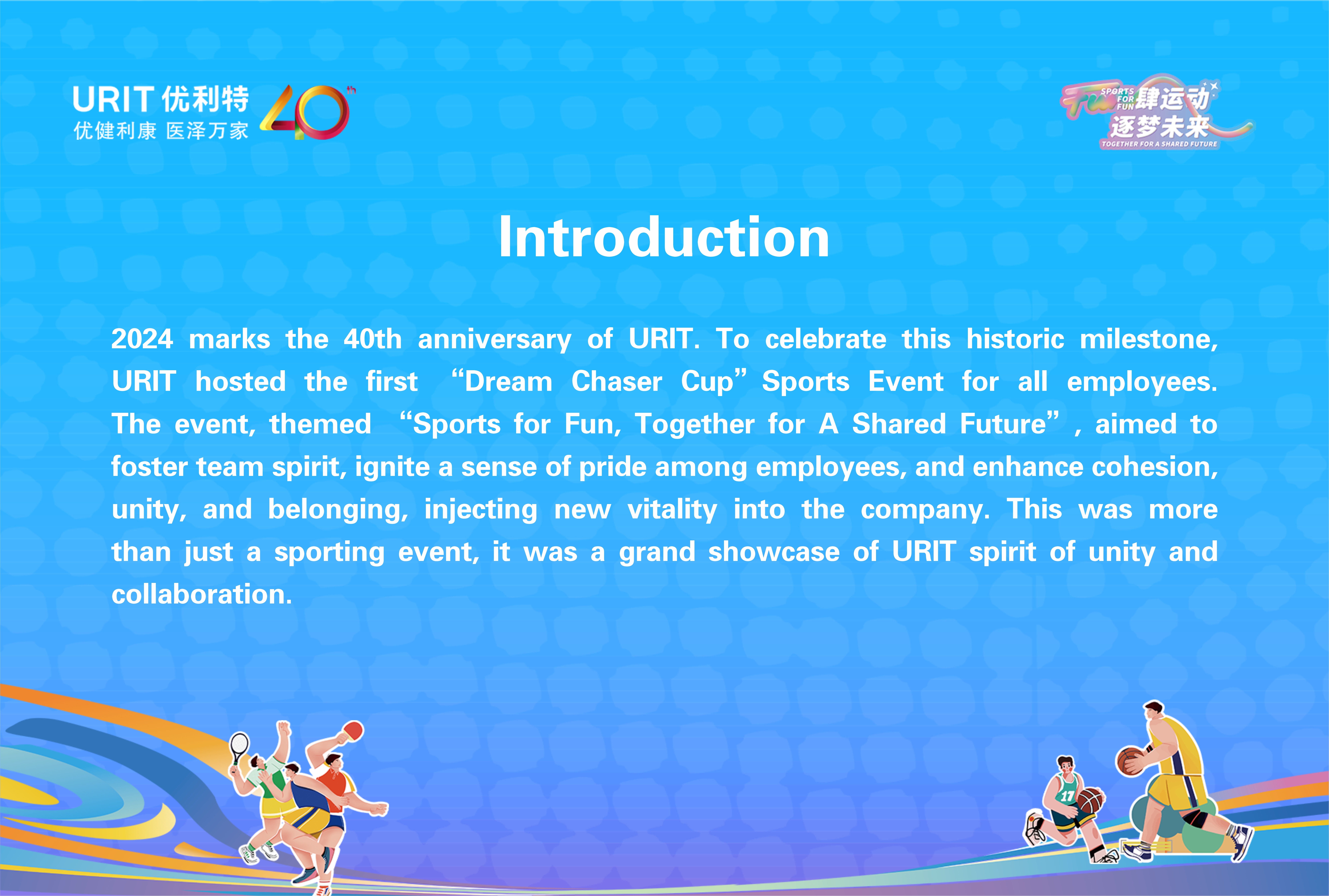 The 40th Anniversary Celebration and first Dream Chaser Cup Sports Event was more than a showcase of athleticism, it was a testament to team spirit and unity. With the motto Delivering Health, Empowering Lives, URIT people will continue striving with determination and innovation, paving the way to the companys centennial milestone.