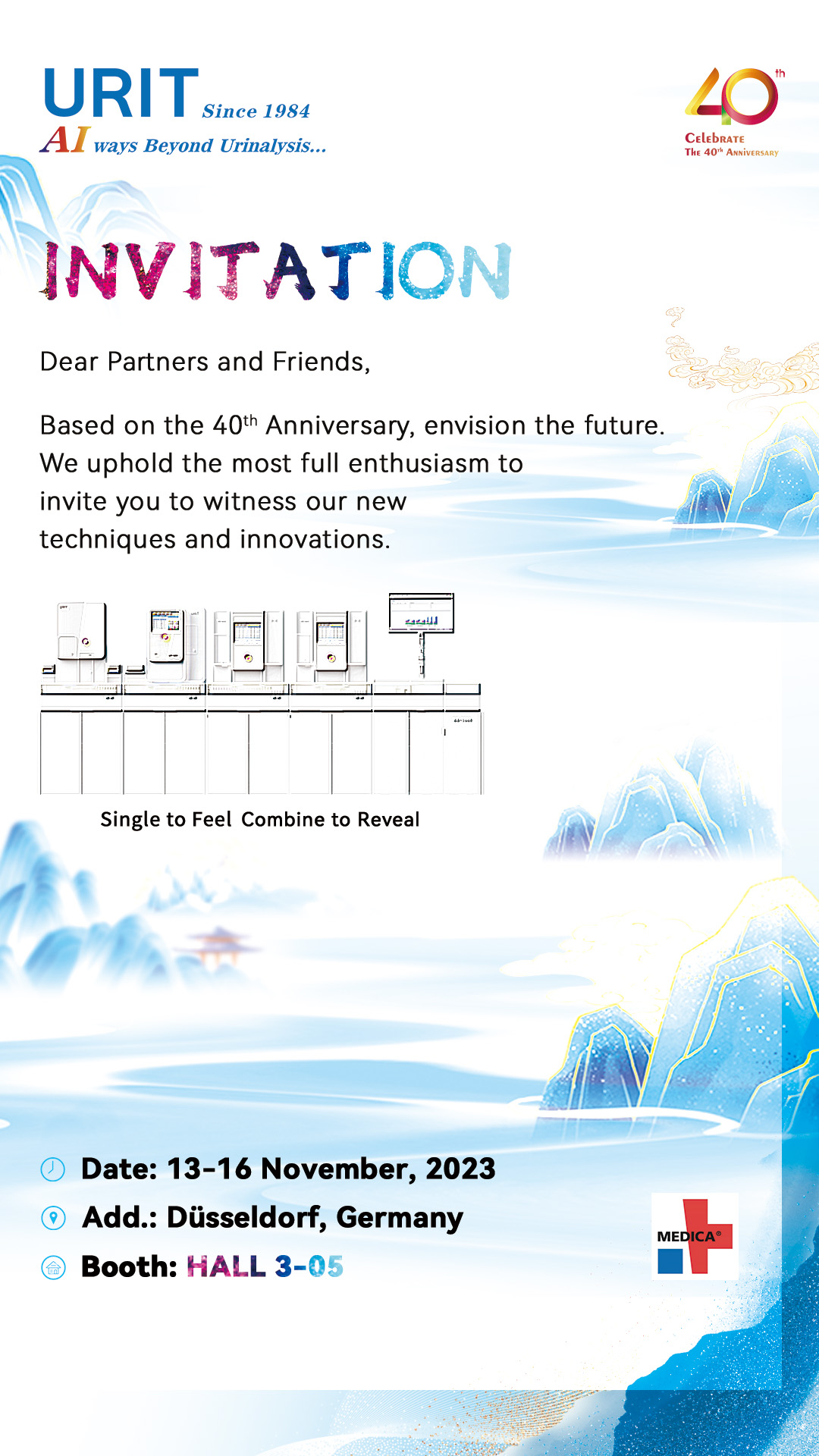 Welcome to visit us at MEDICA 2023. Based on the 40"Anniversary, envision the future. We uphold the most full enthusiasm to invite you to witness our new techniques and innovations.